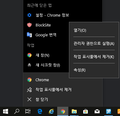 2. 크롬의 단축아이콘에서 마우스 오른쪽 버튼을 누른뒤에 속성에 들어갑니다.