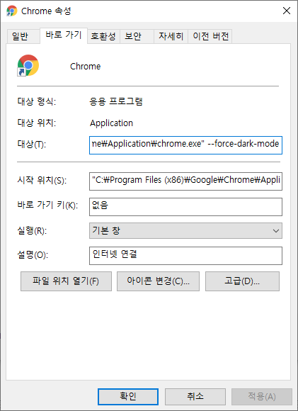 3. 대상(T)의 값의 뒤에 (한칸 띄고)--force-dark-mode 를 넣어줍니다.